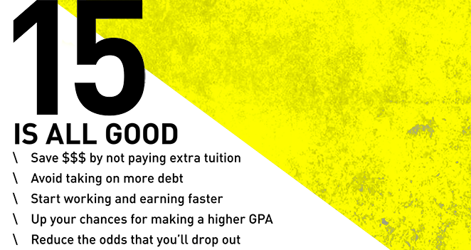 - Taking 15 credits a semester dramatically increases your chances of reaching graduation.